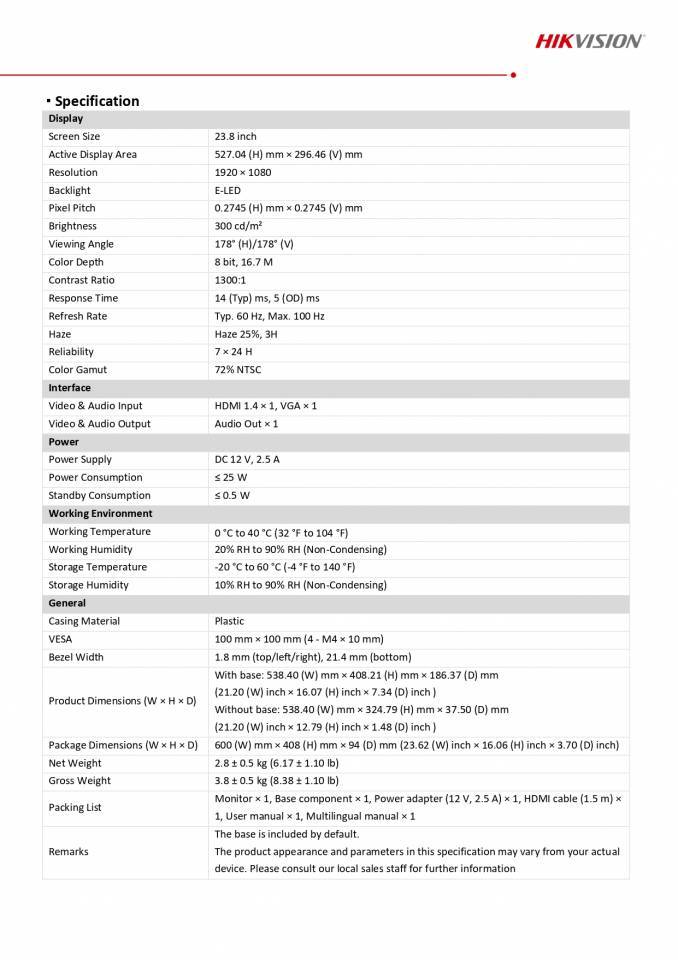 THÔNG SỐ KỸ THUẬT CỦA MÀN HÌNH MÁY TÍNH HIKVISION DS-D5024F2